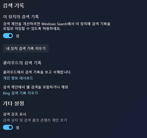검색기록을 로컬에 저장하느냐에 대한 옵션인데 끔으로 변경해주셔도됩니다. 결국 검색할때마다 PC리소스에 저장하는 것을 사용하게 되는거니까요. 꺼도 사용에 무리가없습니다.