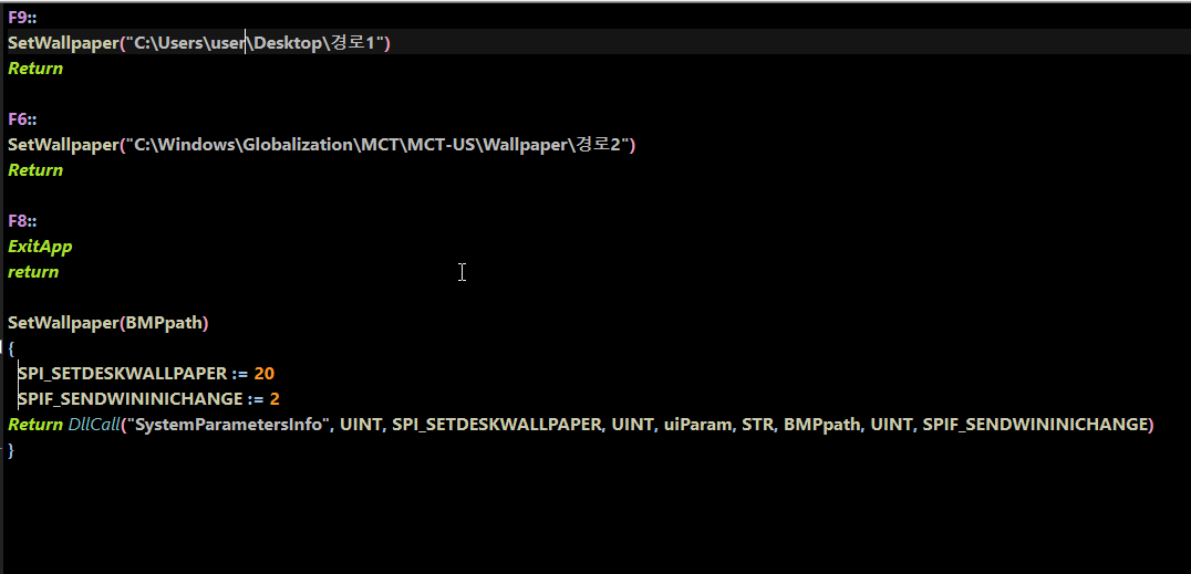 아래 소스는 단축키를 눌러 바탕화 면을 바꾸는 오토핫키 소스입니다. F9와 F6을 누르면 지정해둔 그림으로 바탕화면이 변경됩니다. F8 을 누르면 스크립트를 종료합니다. 단축키 대신 GUI로 버튼을 생성 후 바꾸는 것도 한 방법입니다. 바탕화면 이미지 경로의 경우 C:\wall\1234.png 이런식으로 전체 경로를 적어주시면됩니다. F9:: SetWallpaper("바탕화면이미지 경로 1") Return F6:: SetWallpaper("바탕화면이미지 경로 2") Return F8:: ExitApp return SetWallpaper(BMPpath) { SPI_SETDESKWALLPAPER := 20 SPIF_SENDWININICHANGE := 2 Return DllCall("SystemParamete..